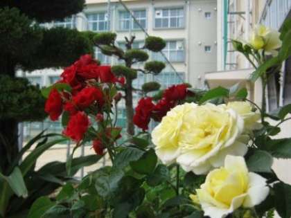 先月、グラウンドに面したプランターに数株のバラの苗を植えていただいたのですが、今週に入ってバラの美しい花が咲くようになりました。水やりや害虫駆除など手入れが大変ですが、地域の方々が毎日のように学校に来てくださり、きめ細やかに面倒を見ていただいているので、状態はすこぶる良好!