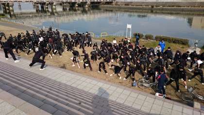 体育館で開会式を行った後、神崎川河川敷に移動して諸注意、準備体操をしました。