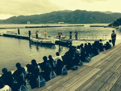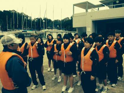 その後、カッター(小型船)操舵の体験を行いました。あいにくの曇り空ですが、海はおだやかで良い感じ。ライフジャケットを着用し、みんなで協力して海へと漕ぎ出しました!