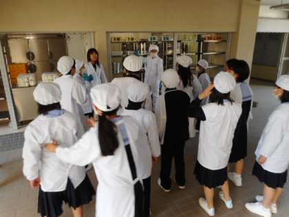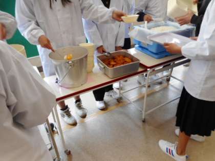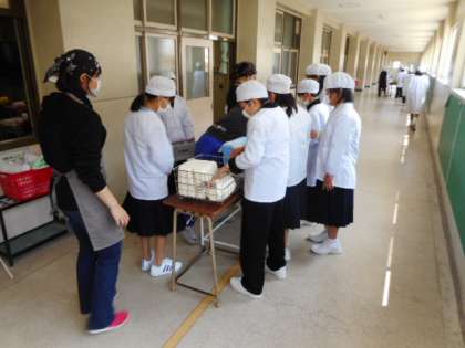 まだ、校舎配置がわからないので、先生が生徒を配膳室に引率しました。その後、当番の生徒が教室まで運び、配膳しました。少し戸惑っていましたが無事に完成。