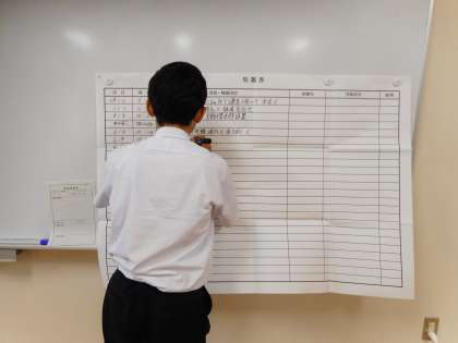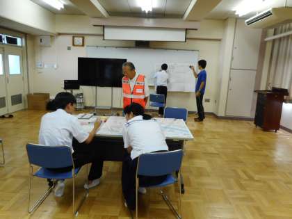 「総務班」「管理班」「物資班」「救護班」「食料班」の5つの班に分かれて、避難所開設について学習しました。