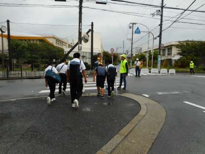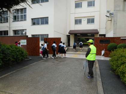 朝早くから、地域の方々に学校周辺の交差点等に立っていただき、生徒たちの登校を見守っていただきました。また、校門前でも、ひとりひとりの生徒に声をかけていただきました。