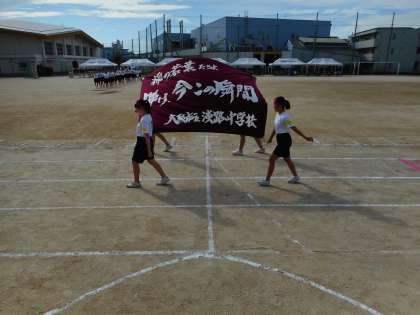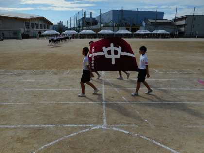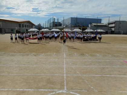開会のことばのあと、吹奏楽部のマーチ演奏で選手が入場しました。どのクラスも、ベストマーチング賞をめざして、クラス一丸となって元気いっぱい堂々と入場しました。見ていてとても気持ちがいい行進でした。