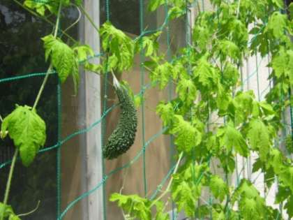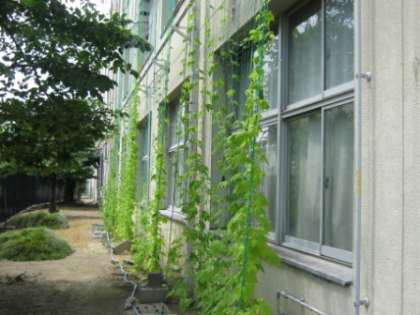植え付けた頃に比べてずいぶん大きくなったとはいえ、校舎の2階部分を覆うまでには至っていませんが、あちこちに小さい実を結び始めました。お昼以降は日陰になり、日照条件があまり良くない中、ツルを伸ばし葉を広げながら精一杯成長しようとする姿に、思わずエールを送りたくなります。