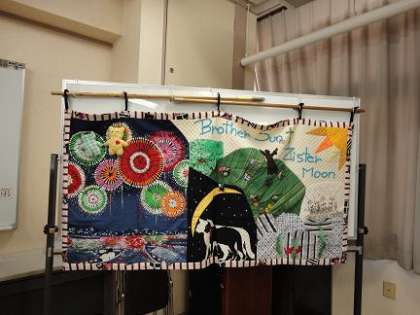 メモリアルキルト・ベビーキルト・メッセージキルトの実物展示(写真:中)の会場の中、講師の方から具体的にわかりやすくお話をしていただき、生徒たちのとても真剣に聴く姿が見られました。