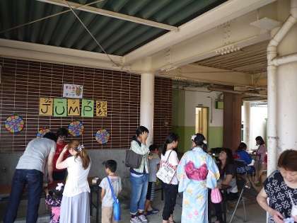 毎年恒例の夏のお祭りですが、この日は台風の影響であいにくの雨模様。屋台やゲームコーナーは雨の影響を受けない廊下で行われ、幼児からお年寄りまで多くの人でにぎわっていました。