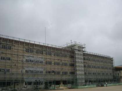 夏休みに入りスタートした校舎の外壁補修工事ですが、作業のための足場がほぼ組み上がりました。