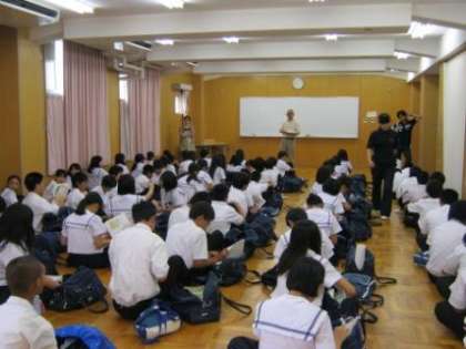 今朝は分厚い雲が空を覆い、いつものぎらぎら照り付ける太陽もひと休みといった様子です。夏休みも残りわずかな中、1年生の学年集会が行われました。