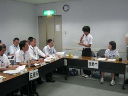 発表のトップバッターは淡路中学校。学校で取り組んでいるクリーンキャンペーンや緑化活動を例に挙げ、花と緑あふれる町づくりを提案しました。また、不審者による被害や街頭犯罪防止のため、街灯を増設し、より明るく安心できるまちづくりの推進を求めました。