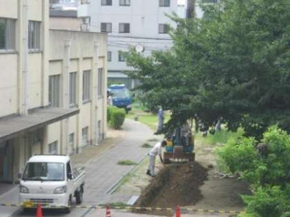 現在、自動で水をまくスプリンクラー設置のため、中庭の一部を掘り返す工事が行われています。運動場への芝生敷設ではないので、体育の授業や体育大会への影響はありませんが、部活動でのランニング時は注意してくださいね。