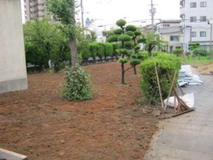 中庭の整地や施肥、水道の工事もほぼ終わり、芝を張る準備が整いました