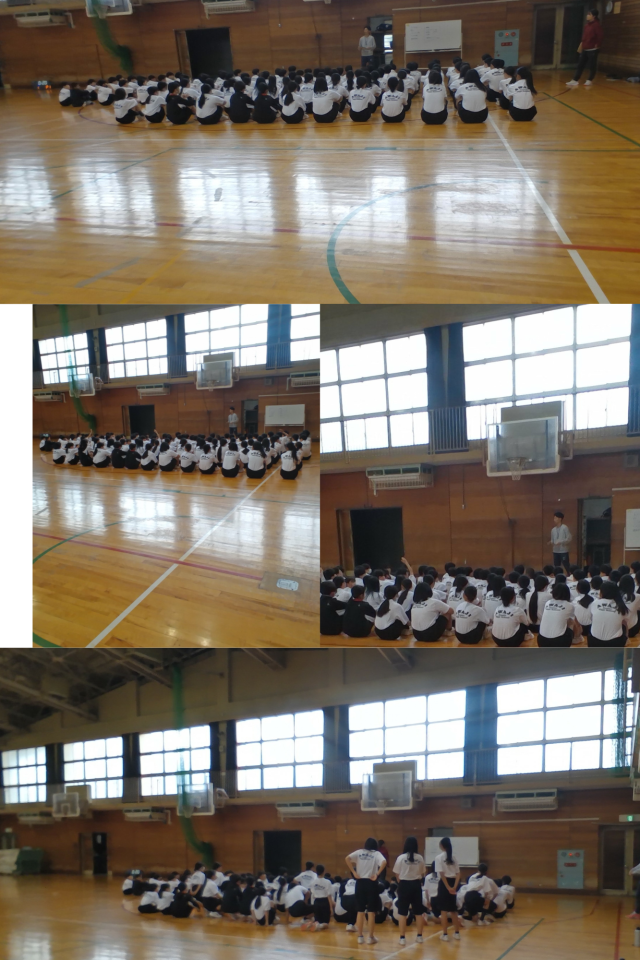 体育館で、授業の前の集合・準備運動について説明を受けています。