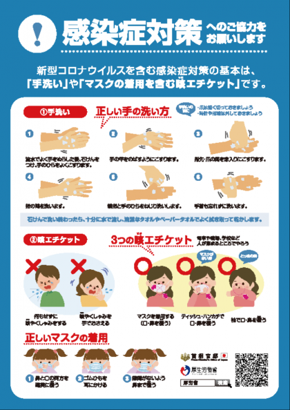 新型コロナウィルスを含む感染症対策の基本は、「手洗い」や「マスクの着用を含む咳エチケット」です。