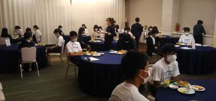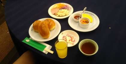 朝食 ホテルでの最後の食事です。眠気のため元気がないですが、健康チェックで体調不良の人はいません。いただきます。