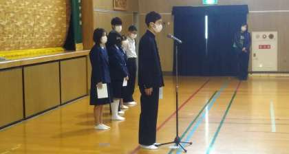 全校集会で、金曜日の生徒会役員選挙で決まった新生徒会役員の認証式を行いました。新役員一人一人に校長先生から認証状が手渡された後、新会長よりあいさつがありました。また、前生徒会役員からも最後のあいさつがあり、生徒会は新メンバーへとバトンタッチされました。