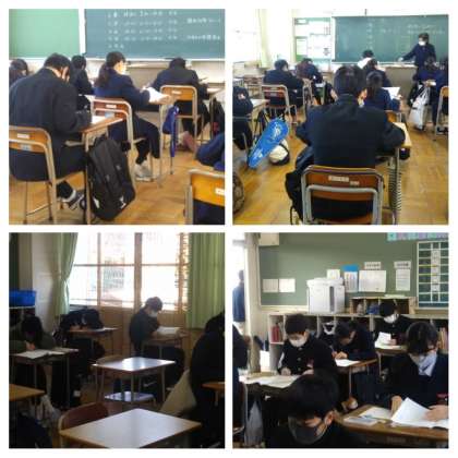1年生は「国語」「数学」「英語」「社会」「理科」の順で、2年生は「国語」「社会」「数学」「理科」「英語」の順でチャレンジテスト(チャレンジテストplus)を実施しました。このテストは、生徒たちが自分の学習到達状況を正しく知ることにより、学習目標や学力向上への意欲を高めるためのものです。生徒たちは、問題に一生懸命取り組んでいました。