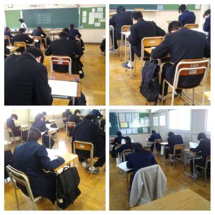 3年生は、今日から2日間、中学校での最後のテストとなる学年末テストが始まりました。1日目の今日は、技家・英語・国語・保体の4教科でした。このテストが終われば、いよいよ受験本番に向かいます。緊張の続く毎日となりますが、健康管理には最大限の注意をはらい、目標に向かって頑張ってください。