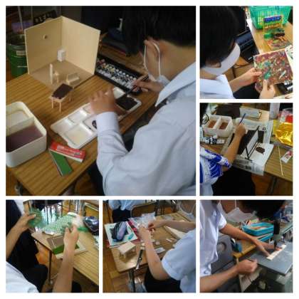 3年生の美術の授業で”3次元ボックスアート”を制作しています。現実的なもの・架空の世界・現在・過去・未来?など各自がイメージを膨らませ、様々な材料を使い作品にしています。