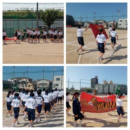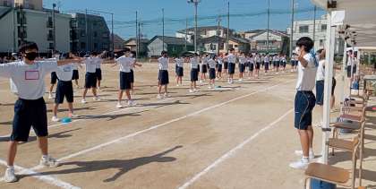 校旗を持つ生徒会を先頭に、2年ぶりの入場行進では青団、赤団の順に入場しました。開会式後、最初のプログラム”合同体操”は全員でラジオ体操を行いました。