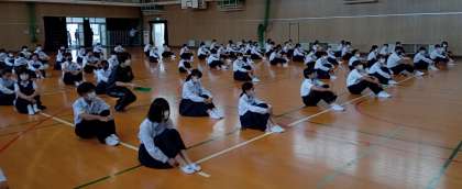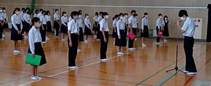 朝の生徒朝礼は、2学期になって初めて体育館で行うことができました。はじめに、各学年の代表生徒へ"総合文化祭 展示発表 美術の部"の賞状伝達がありました。その後、校長先生からノーベル物理学賞の受賞が決まった"真鍋淑郎"さんの話があり、選挙管理委員会より"後期生徒会役員選挙"に向けてのお知らせがありました。