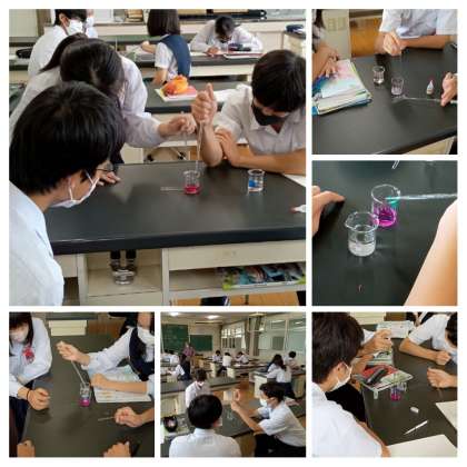 3年生の理科の授業で、”水酸化ナトリウム水溶液に塩酸を加えるとどうなるか?”の実験をしました。緊急事態宣言中は感染リスクの高い活動はできなかったため、理科の授業で「実験」を行うのは久しぶりです。生徒たちは、鮮やかな赤色が塩酸を加えると、一瞬にして無色になるのを見て驚いていました。