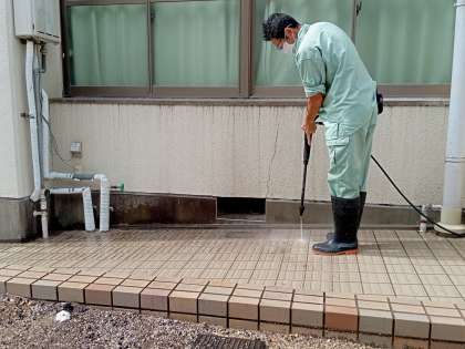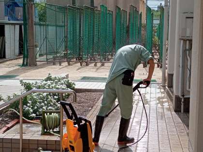 朝から管理作業員さんが、正門付近の汚れを高圧洗浄機を利用してきれいにしています。十数年の汚れが、見事に落ちていきます。いつまでもきれいな学校であるように、皆さんも心がけましょう。