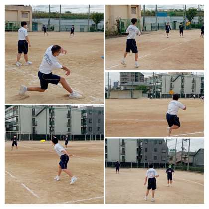 3年生の体育は、男子はグラウンドで"フライングディスク"の授業を行っています。どれだけ遠くへ、正確に投げられるか練習をした後、チームに分かれてのゲームを行いました。女子は体育館で"跳び箱"を行っています。3段階の高さに分かれて練習をしました。