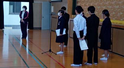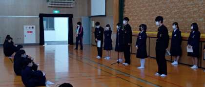 本日の生徒朝礼で、先日行われた生徒会役員選挙で、新しく生徒会役員になった生徒へ認証状が渡されました。柴島中学校をさらに良い学校にしていくためには、生徒会役員の力だけではできません。皆さん一人ひとり、それぞれの良さを発揮し合って、柴島中学校を盛り上げていってほしいと思います。