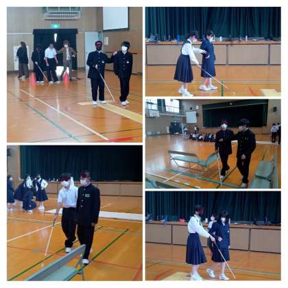 5,6限、1年生は先日に引き続いて"あたり前学習"(福祉体験)で、車いす体験とアイマスク体験を行いました。車いす体験は、4人1班で指定された校外コースを、目的地まで交替で体験をしました。アイマスク体験は、2人1組になり1人がアイマスクを、1人が手引き介助をし、体育館に設置された"点字ブロック""マット""スラローム"などを体験しました。