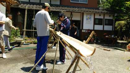 (写真下)自分たちで作ったセットで食べる流し素麺は最高です!