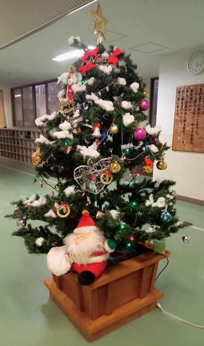 玄関ピロティには生徒会役員でクリスマスツリーの飾りつけをしました。来年は、クリスマスツリーを輝かす電飾のように青色や緑色の明るい年になることを願います。
