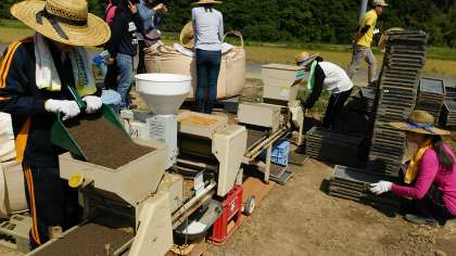 (写真)苗を育てる箱に種まきをしているところです。土を敷いて、その上に種籾を撒き、さらにその上からまた土を被せるという作業です。
