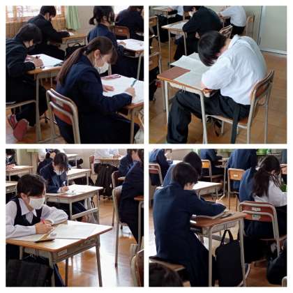 本日、中間テストの2日目です。朝から全学年「社会」「理科」を、2年生は3限目に「技術家庭」のテストに挑みました。中間テストが終わると、来週は皆が楽しみにしている"3年修学旅行""2年職場体験""1年一泊移住"が予定されています。体調を崩すことがないように、健康管理はしっかりと行なってください。
