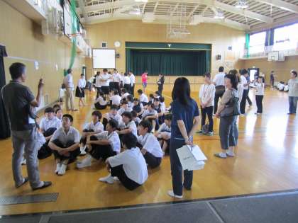 3時間目は、地域の町会長さん、防災リーダーさんをお招きし、PTA実行委員会の皆様の協力のもと、町会ごとに生徒が集まる「町会集会」を行いました。