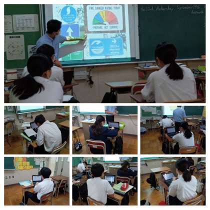 3年生の英語科の授業は、資料映像を見て防災・安全への関心を高めることを目標に学習しました。