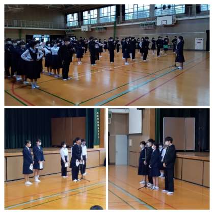 朝、体育館で、生徒会役員の認証式が行われました。校長先生から一人ひとりに認証状が渡された後、新会長から"柴島中学校のために、より良くしていきたい"と思いの込められた言葉があり、そして、1年間柴島中学校のために頑張った、旧役員からの挨拶がありました。