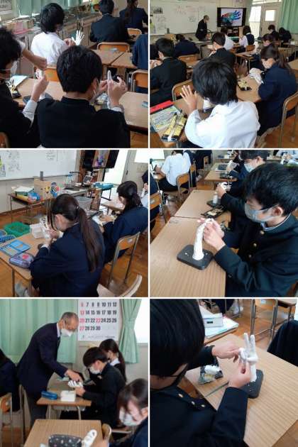 2年生の美術科の授業は、手の骨格に粘土をつけていき”手”を作っています。思い思いのポーズを決め、自分の手と比べながら作成していました。