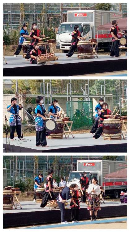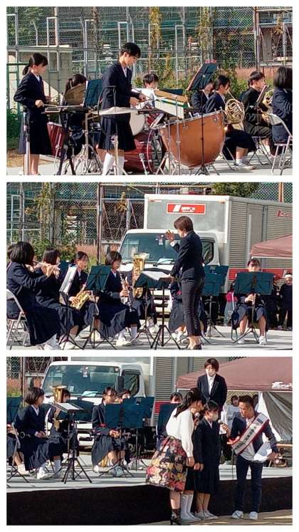 本日、柴島浄水場グラウンドで開催された「東淡路・柴島 秋フェス2022」に、太鼓部と吹奏楽部が出演しました。司会の東淀川区住みます芸人の福人(ふくんちゅ)さんと地元出身のタレントたかはしあいこさんから紹介で、披露した演奏に会場から大きな拍手が送られました。