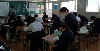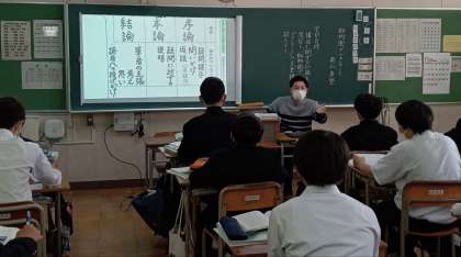 2年生の国語科の授業では、評論文を読み学習を進めています。説明的文章の構成に関する知識を復習し、評論文の構成を捉えることをねらいとして学習しました。今日は教員の授業力向上を図ることなどを目的にしているスクールアドバイザーの先生にお越しいただき、授業を参観していただきました。