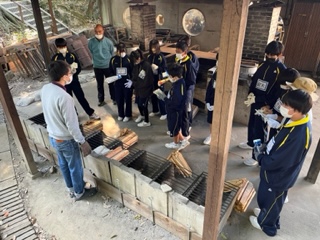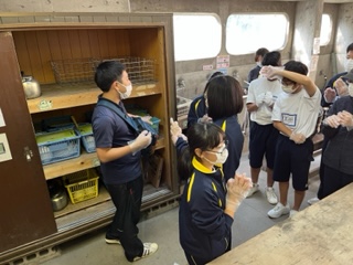 かまど、食器、調理器具の係に分かれての作業です。