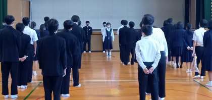 朝、体育館で生徒朝礼を行いました。生徒会から今週の予定を、校長先生から”明日がある、明後日があるではなく、今日を大事に”明日からの期末テストを頑張ってください、と話がありました。その後、生活指導の先生から、防寒着についてと休み時間の過ごし方についての話がありました。
