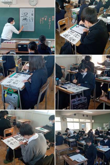 2年生の国語科の授業は書写を行っています。行書で「諸行無常」と書きました。皆、気持ちを落ち着けて半紙に筆を走らせていました。3枚の練習の後、3枚の清書を仕上げました。