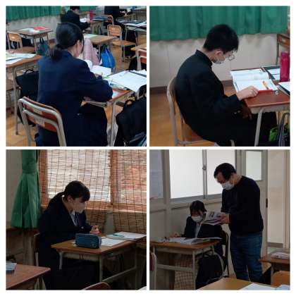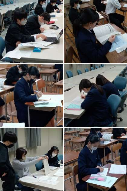 5,6限、3年生は受験に向けての書類作成などを行いました。私立を受験する人は「願書」の作成を、公立を受検する人は「自己申告書」の作成を、完成した人などは今月の23日から始まる学年末テストに向けた勉強をしました。今やらなければならないことに、一人ひとりが真剣に取り組んでいました。