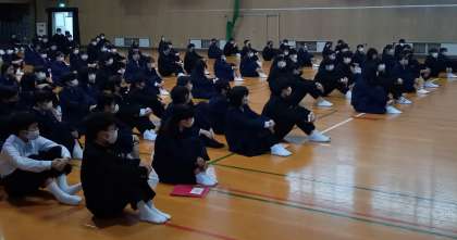 朝から雨が降っていますが、全校生徒が体育館に集まり生徒朝礼を行いました。校長先生から、3年生に”人事を尽くして天命を待つ”、1・2年生に”光陰矢の如し”のことわざが伝えられ、残りの学校生活についての話がありました。