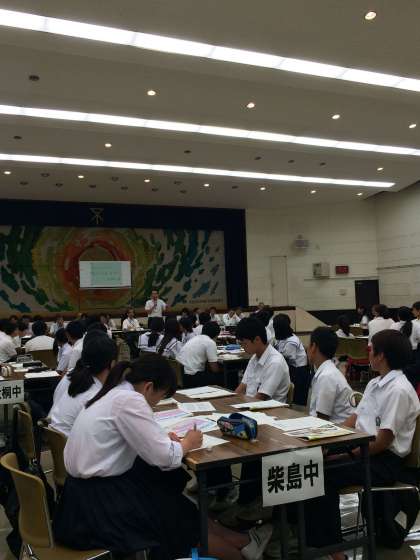 台風も心配された始業式の日の午後、毎年恒例の生徒会交流会が東淀川区役所で行われました。柴島中学校からは生徒会執行部メンバー全員で参加しました。