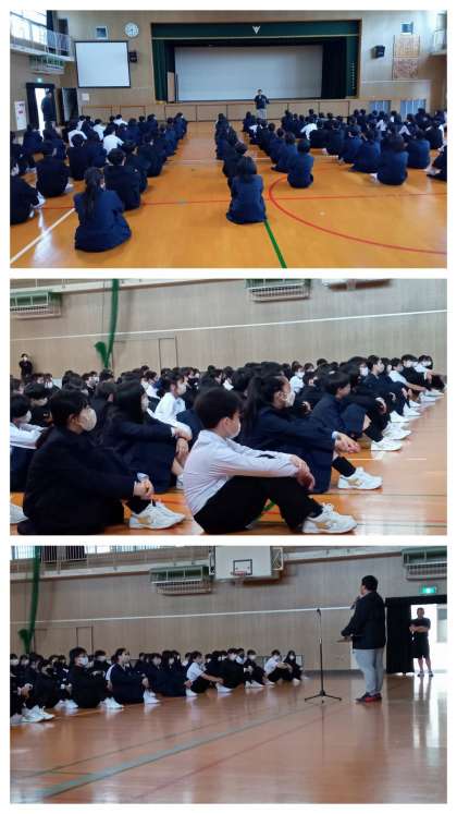 昨日に引き続いて、朝、全校生徒が体育館に集まり朝礼指導を行いました。生活指導担当の先生より”学校のルール”などについての話がありました。昨年度、生徒会が中心となって校則について話し合いを行い、ルールの見直しをしたポイントなどの確認をしました。