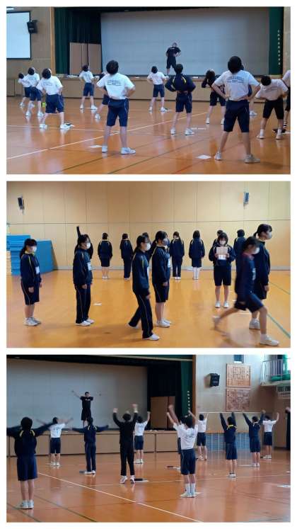 3年生の体育の授業は、男子は体育館で”ラジオ体操”を、女子は格技室で”整列”を行っています。男子のラジオ体操では、一つ一つの運動のポイントを確認しながら進めています。女子の整列では、体育委員の号令に合わせて隊列の変化を行っています。