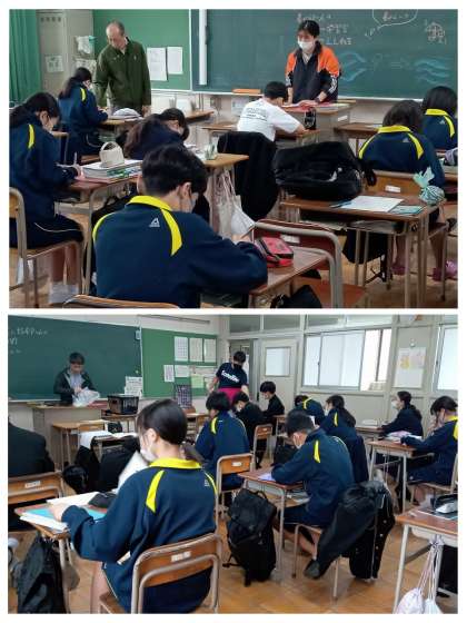朝の学活、2年生はそれぞれの課題を決めて時間を使っています。今朝の登校時の激しい雨もあり、学生服がベトベトに濡れてしまった人も多く、体操服に着替えてから課題に取り組んでいました。