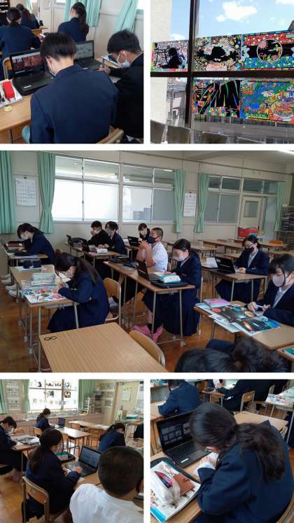 2年生の美術科の授業は、プッシュステンドでステンドグラス風の作品づくりをしています。テーマは”生き物”で、今日はアイデアを考えスケッチをしました。窓に貼られてある先輩の作品や、タブレット端末で生き物を検索しながら考えていました。