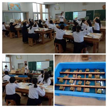 1年生の技術科の授業は技術室で行っています。”作物の成長を管理する技術”について、穴だらけのキャベツから考えました。今、ミニトマトの生育経過を観察するために、スポンジに種をまいたところで、少しずつ発芽してきています。